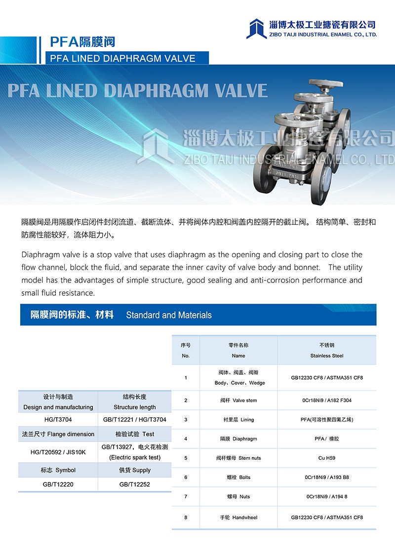 太极氟塑料PFA隔膜阀是用隔膜作起闭件封闭流道、截断流体、并将阀体内腔和阀盖内腔隔开的截止阀。结构简单、密封和防腐性能较好,流体阻力小。